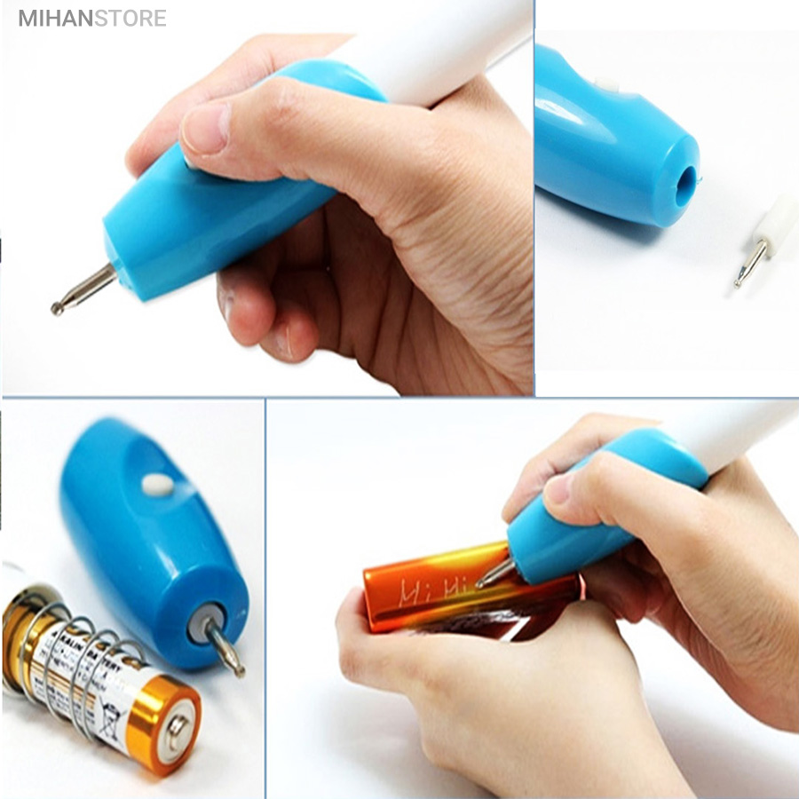 ابتدا دو عدد باطری قلمی قوی (آلکالاین) داخل دستگاه قرار دهید (برای باز کردن درب قلم قسمت سفید رنگ بدنه را به سمت حرکت عقربه های ساعت بچرخانید) سپس دکمه دستگاه را فشار دهید تا دستگاه روشن شود. این قلم به گونه ای طراحی شده که اگر انگشتتان را از روی دکمه بردارید خاموش می شود. برای تراش سطوح باید مته را به سطح مورد نظر نزدیک کنید ، دقت کنید مته را بیش از حد روی سطح فشار ندهید چرا که مته از چرخش می ایستد. هنگام استفاده نیاز به فشار دادن زیاد سری مته به سطوح نیست و فقط به حدی مته را به سطح مورد نظر چسانید که مته بتواند روی سطح بچرخد و آن را بتراشد.